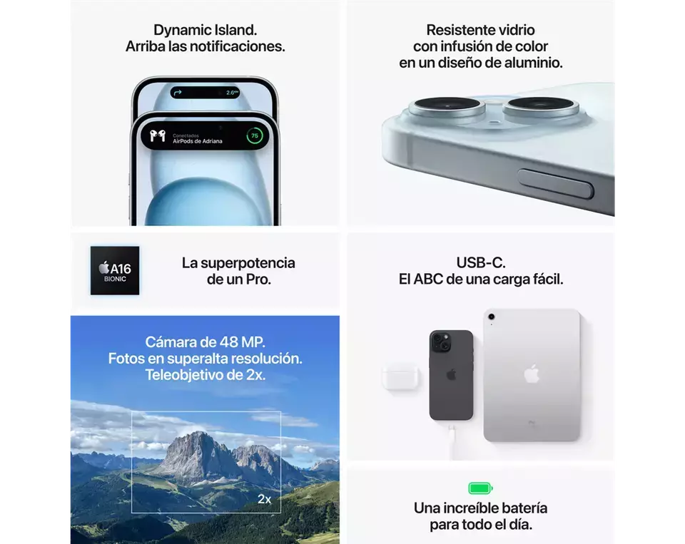 • Pantalla: Super Retina XDR OLED de 6.1′′, 2532×1170 px, 460 ppi, HDR, True Tone, contraste 2 000 000:1, brillo típico 1000 nits, pico HDR 1600 nits, exterior 2000 nits, Dynamic Island